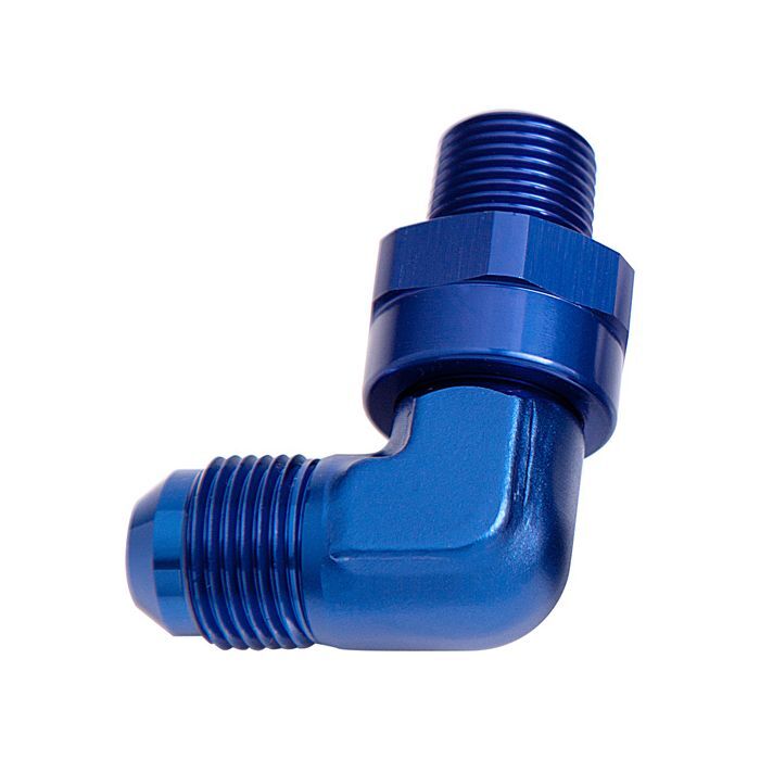 Male NPT to Male AN adapter. Adapt from an NPT thread to AN flare with a 90 degree bend and full 360 degree swivel. Various sizes available.